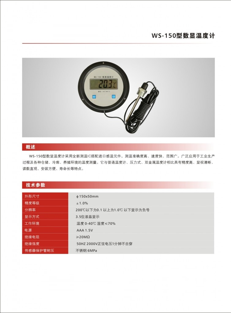 主題特點:WS-150型數顯溫度計采用全新測量IC,搭配進口感溫元件,測溫準確度高,速度快,范圍廣。廣泛應用于工業生產過程中,及各種倉儲,冷庫,養殖環境的溫度測量。